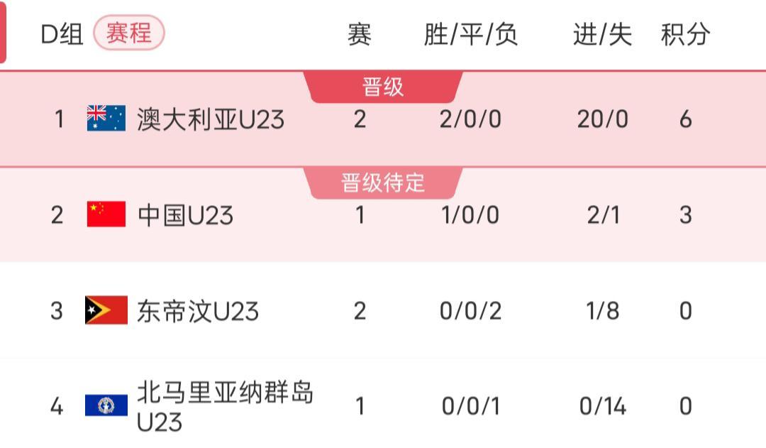 目前同组澳大利亚U23以两场20个净胜球位列榜首,国足若本场比赛未能大比分战胜对手建立优势,出线形势将变得扑朔迷离。