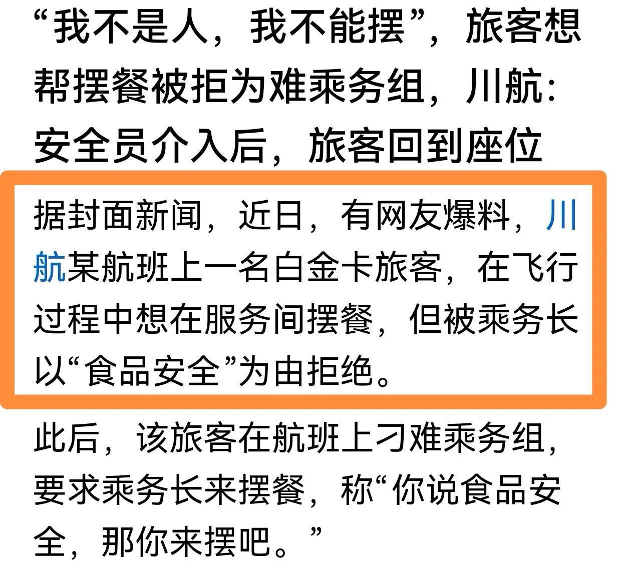 信源来源:封面新闻 2025-08-21 川航回应“乘客摆餐事件”:航空安全员介入处置后,旅客回到座位